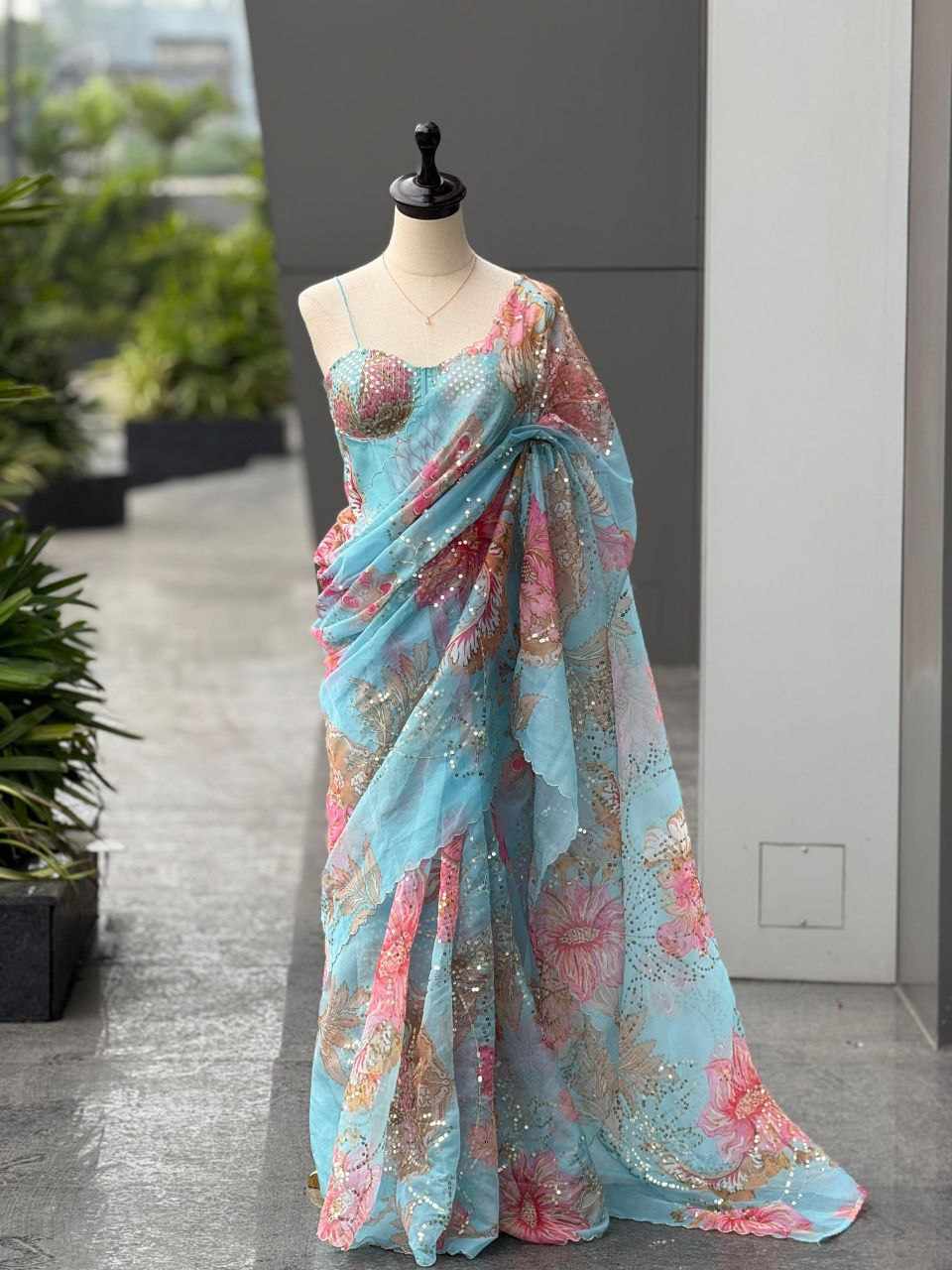 Saree – Pure Jimmy Organza digital printed saree embellished with beautiful sequins work, giving it a graceful and festive appeal